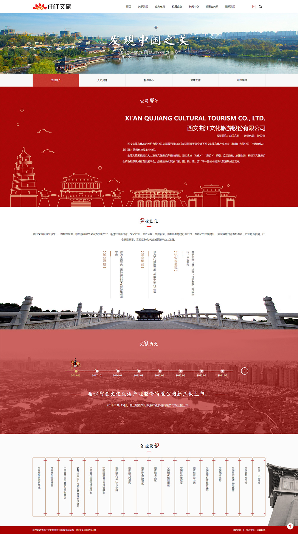 西安曲江文化旅游股份有限公司是隸屬于西安曲江新區管理委員會(huì )旗下西安曲江文化產(chǎn)業(yè)投資(集團)有限公司(全國文化企業(yè)30強)的國有控股上市公司。曲江文旅緊抓國家大力發(fā)展文化旅游產(chǎn)業(yè)的機遇,堅定實(shí)施“文化+”“旅游+”戰略,立足西安,放眼全國,構建了文化旅游全產(chǎn)業(yè)鏈條集成運營(yíng)發(fā)展平臺,是涵蓋文化旅游“策、規、投、建、營(yíng)“于一體的中國文化旅游集成運營(yíng)商。