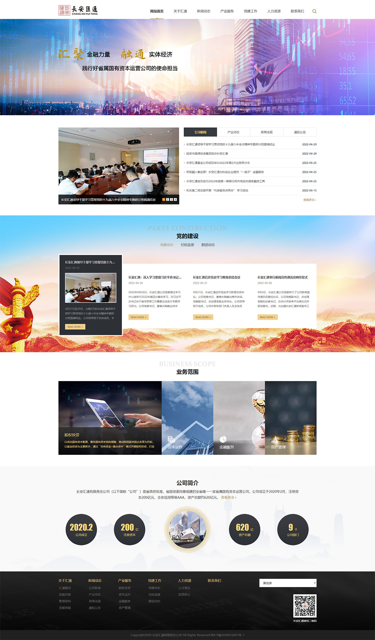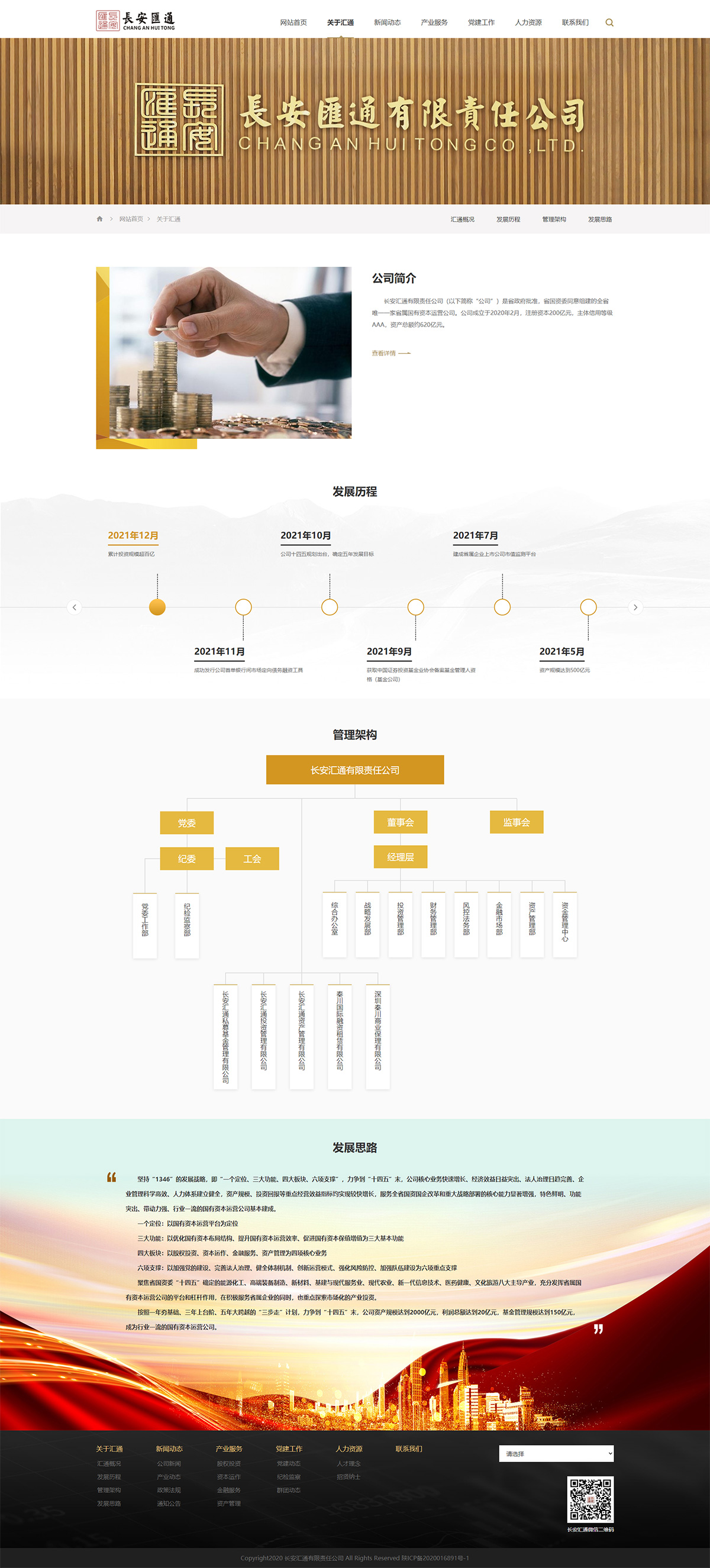 長(cháng)安匯通有限責任公司(以下簡(jiǎn)稱(chēng)“公司”)是省政府批準,省國資委同意組建的全省唯一一家省屬?lài)匈Y本運營(yíng)公司。公司成立于2020年2月,注冊資本200億元,主體信用等級AAA,資產(chǎn)總額約620億元。公司設有綜合辦公室、黨委工作部(紀檢監察部)、戰略發(fā)展部、投資管理部、財務(wù)管理部、風(fēng)控法務(wù)部、金融市場(chǎng)部、資金管理中心、資產(chǎn)管理部等9個(gè)職能部門(mén)及基金管理、投資管理、資產(chǎn)管理、秦川租賃、秦川保理5家全資子公司,現有職工106人。