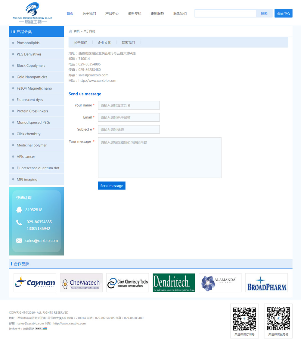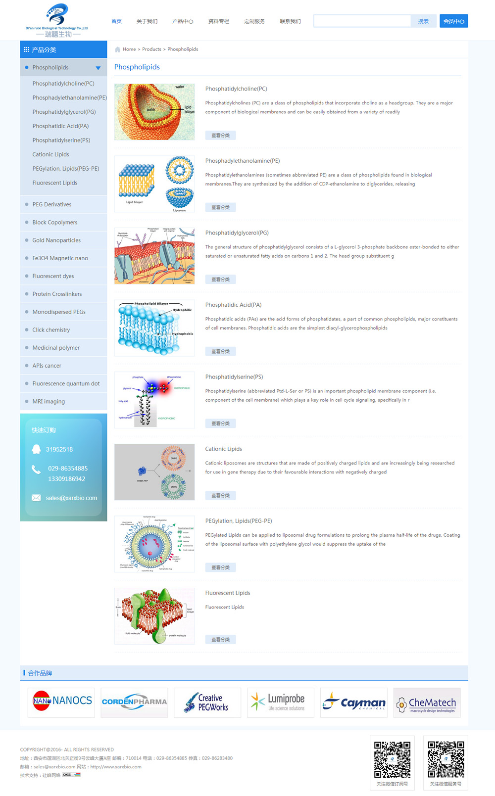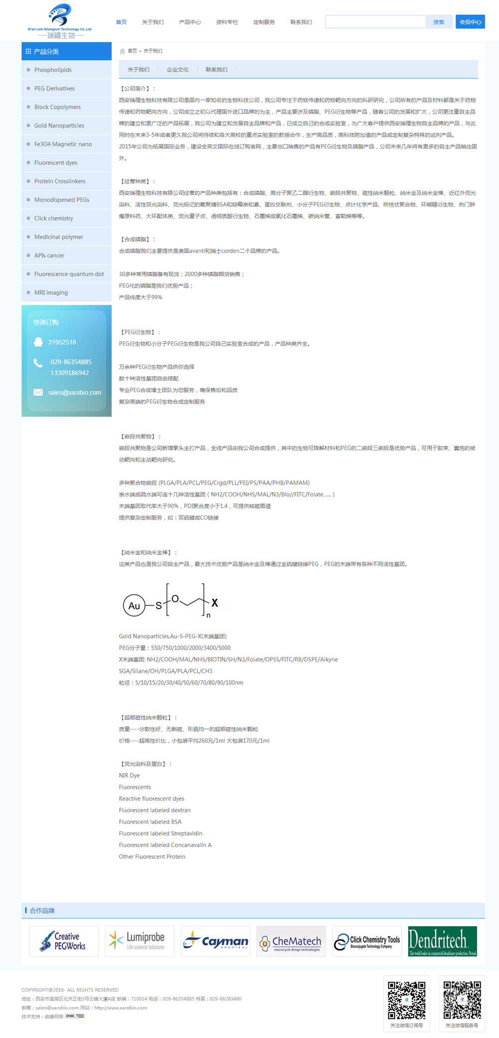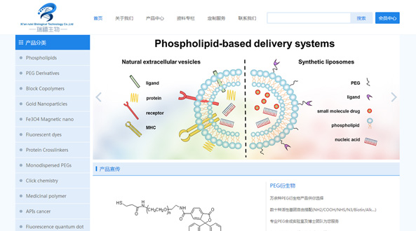 西安瑞禧生物科技有限公司是國內一家知名的生物科技公司,我公司專(zhuān)注于藥物傳遞和藥物靶向方向的科研研究,公司所有的產(chǎn)品及材料都是關(guān)于藥物傳遞和藥物靶向方向,公司成立之初以代理國外進(jìn)口品牌的為主,產(chǎn)品主要涉及磷脂、PEG衍生物等產(chǎn)品,隨著(zhù)公司的發(fā)展和擴大,公司更注重自主品牌的建立和更廣泛的產(chǎn)品拓展,我公司為建立和發(fā)展自主品牌和產(chǎn)品,已成立自己的合成實(shí)驗室,為廣大客戶(hù)提供西安瑞禧生物自主品牌的產(chǎn)品,與此同時(shí)在未來(lái)3-5年或者更久我公司將持續和各大高校的重點(diǎn)實(shí)驗室的教授合作,生產(chǎn)高品質(zhì),高科技附加值的產(chǎn)品或定制復雜特殊的試劑產(chǎn)品。
