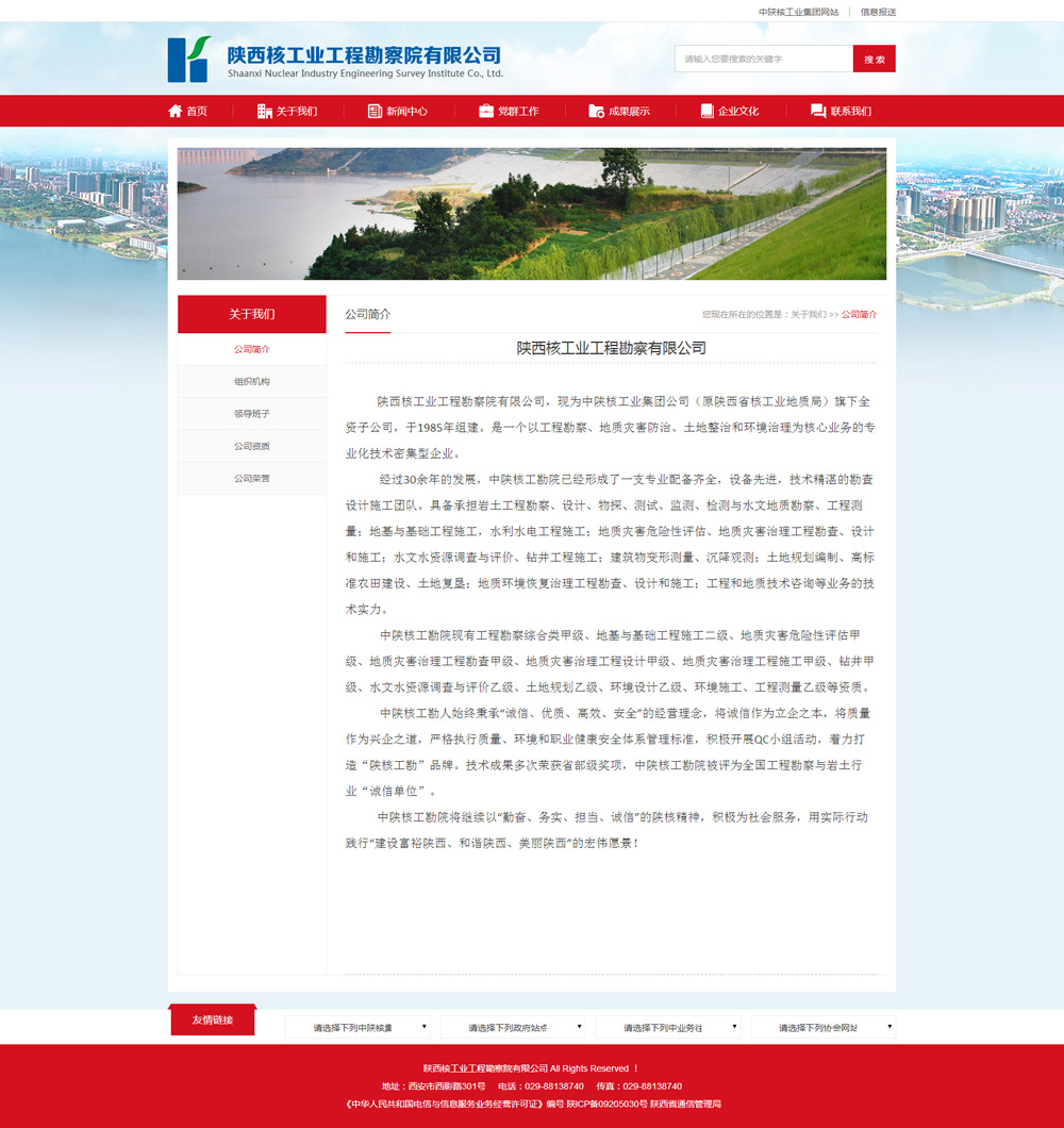 陜西核工業(yè)工程勘察院有限公司,現為中陜核工業(yè)集團公司(原陜西省核工業(yè)地質(zhì)局)旗下全資子公司,于1985年組建。是一個(gè)以工程勘察、地質(zhì)災害防治、土地整治和環(huán)境治理為核心業(yè)務(wù)的專(zhuān)業(yè)化技術(shù)密集型企業(yè)。