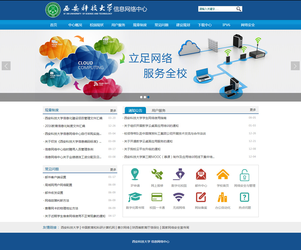 西安科技大學(xué)校園網(wǎng)始建于1999年,2001年正式成立網(wǎng)絡(luò )中心,部門(mén)暫時(shí)掛靠在??萍继?。2009年,網(wǎng)絡(luò )中心調整為校直屬單位,2014年更名為信息網(wǎng)絡(luò )中心。中心承擔學(xué)校教育信息化和校園網(wǎng)的規劃建設、運行管理等工作。